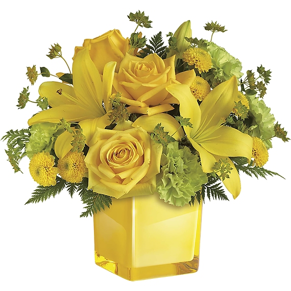 You can't help but smile at these bright, beautiful blooms! Like a ray of sunshine, this golden mix of roses and lilies, presented in Color Splash cube, will put anyone in a marvelous mood.