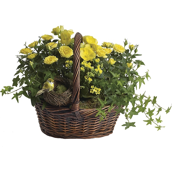 An outstanding pick for an outdoorsy friend! Great for green thumbs and houseplant lovers, this graceful yellow arrangement of three potted plants in a basket is decorated with a sweet bird and nest. plant varities may vary